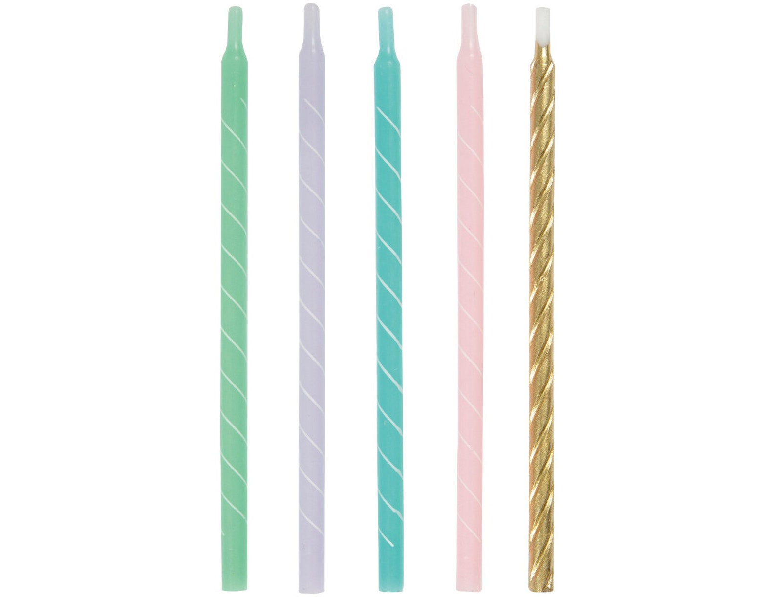 Tall gold and pastel coloured cake candles are the perfect finishing touch for your birthday cake decorations.
